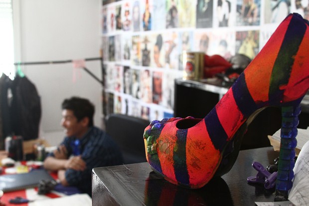 Walking into Seyf Dean Laouiti’s accessories atelier in Tunis, I feel a bit like Alice falling down the rabbit’s hole. Shoes, jewelry, books, and various knick-knacks are stacked on shelves, tables and a sewing stand. Spilling out of a bag are pieces from Laouiti’’s new collection, fresh from a recent photo-shoot for his magazine, FFDesigner. A box of rosettes sits on one desk, a skull ash tray on another, and a lip-shaped telephone on a shelf. It’s like a grown-up playroom, and Laouiti (with his spike-adorned top-hat) is the Mad Hatter and creator-in-chief.