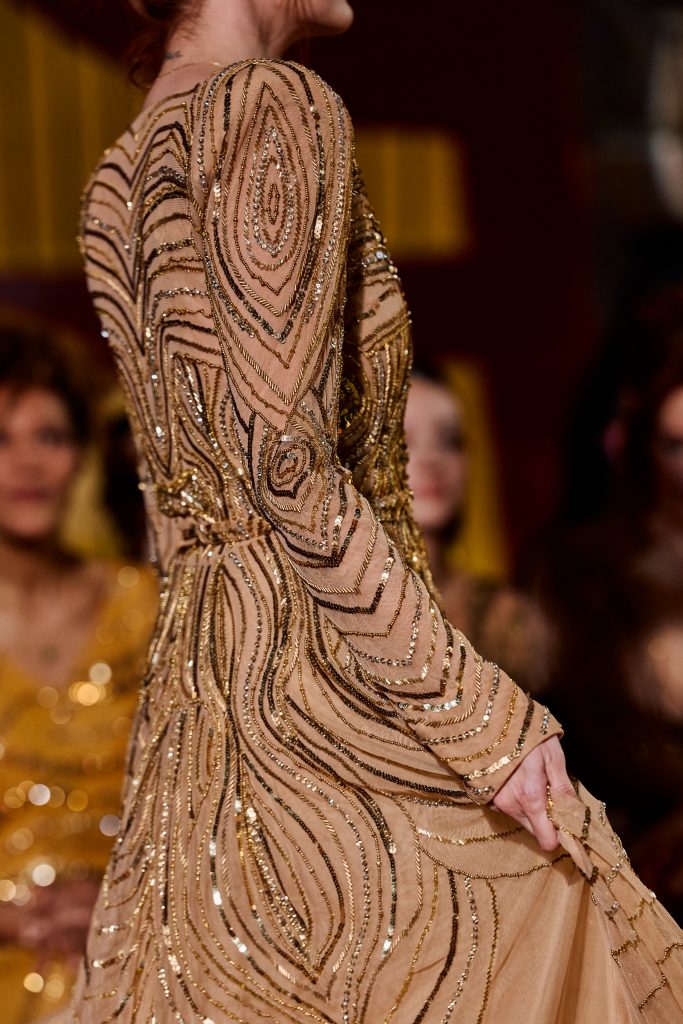 Des lignes très esthétiques qui rappellent la peau diaphane sous la lumière. De l’ambre chaud évoque la lueur de la fin d’après-midi. Les broderies de tubes mats et brillants sont déclinées pour un effet de stries