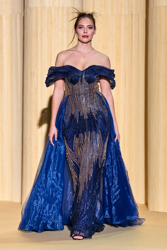 longue robe fourreau à traine en tulle marine rebrodé avec manchons en volutes – long navy tulle gown with a train, featuring scrolled sleeves and embroideries