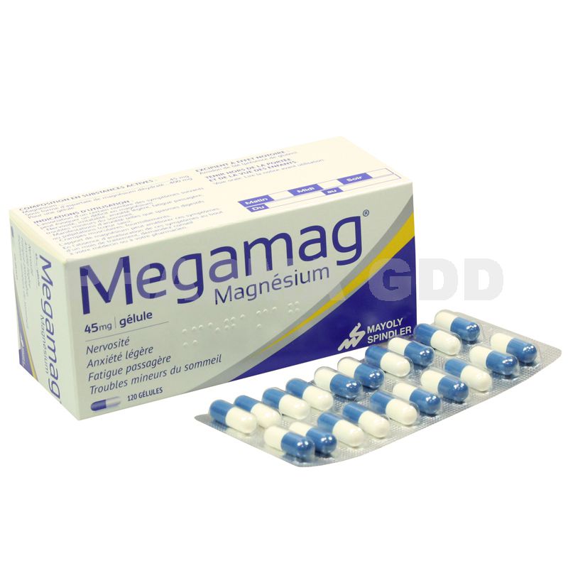 Magnésium sous forme de sel d’aspartate, il est reconnu pour son efficacité et surtout sa bonne tolérance digestive. 60 gélules pour soi un traitement court de 15 j ( posologie 4 à 6 gelules par j au cours des repas) ou le MEGAMAG 120 gélules pour une cure de 60 j ( 4 à 6 gellules par j reparties en plusieurs prises au cours des repas avec un grand verre d’eau)