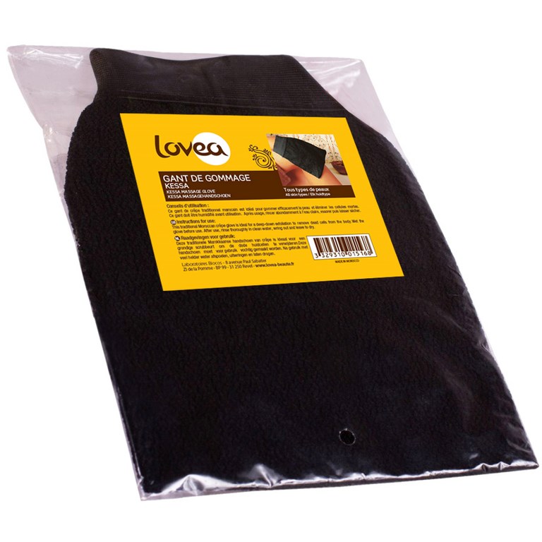 Pour parfaire ce gommage, rien de tel que l’utilisation du Gant de massage kessa  Lovea, gant de crêpe traditionnel pour exfolier efficacement votre peau. Débarrassée de toutes ses impuretés, votre peau est incroyablement douce, lisse et nette, fin prête à recevoir son soin hydratant.