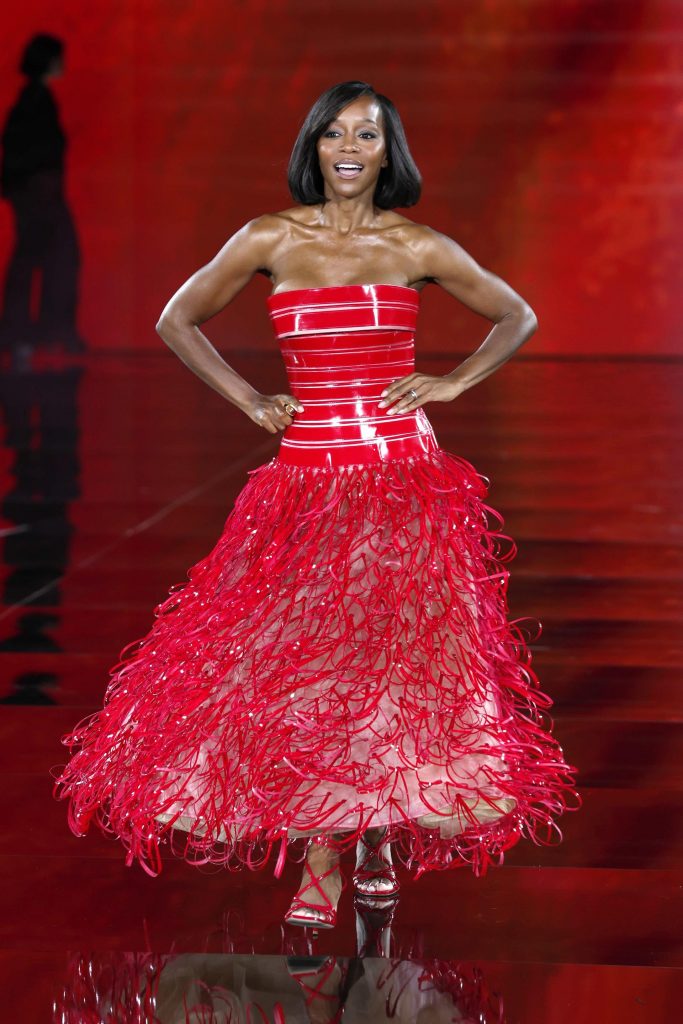 Aja radiated in a strapless red 7/8ème gown from the Couture Fall/Winter 2025–2026 collection, featuring a structured bodice in bands of vinyl and a voluminous nude tulle skirt embroidered with looped red paillettes.
