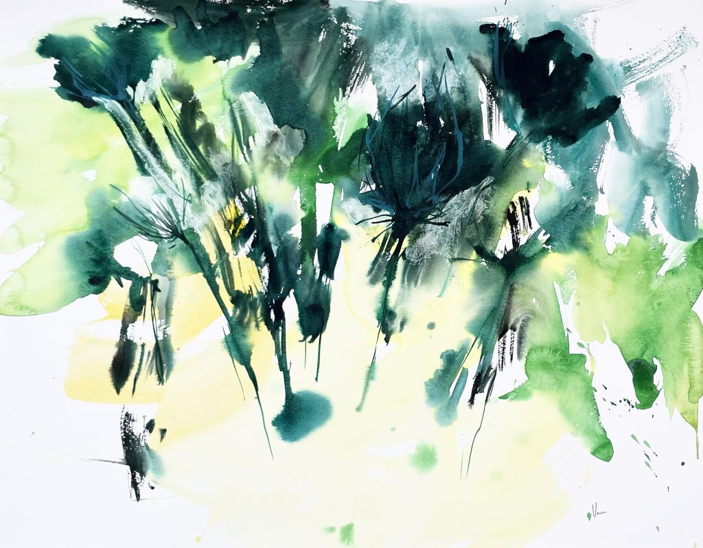 Rien n’est figé, essentiellement en mouvement quand elle commence, elle ne sait pas en avance ce que cela donnera ” si j’ai envie de peindre une fleur, je le ferai mais je l’imaginerai alors dans le vent, en mouvement” explique telle.