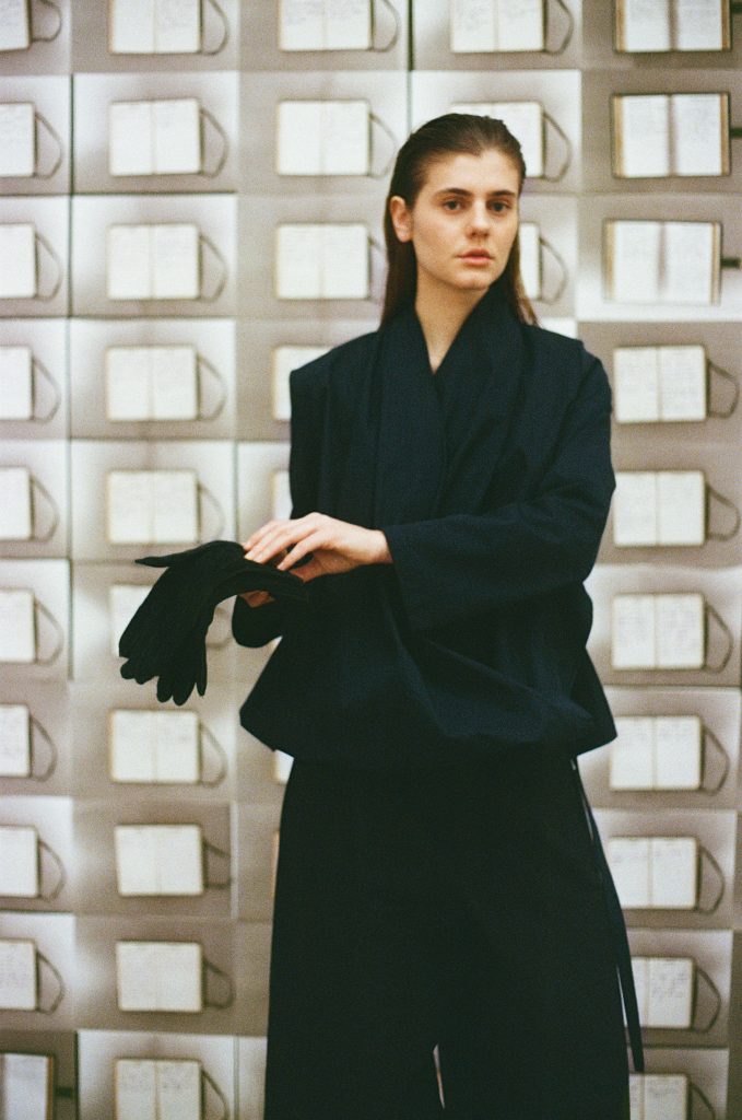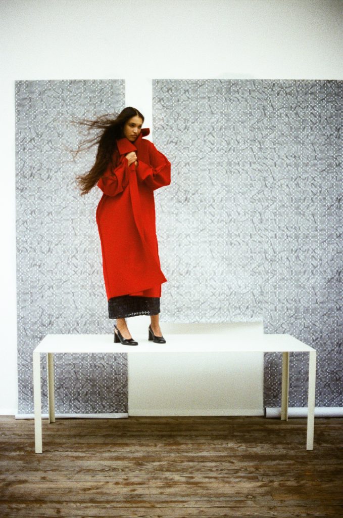 The garments, are passe partout, adjustable with laces and elastic. They are designed to adapt to different body types and postures. Alongside continuous solutions, such as puppet dresses, voluminous skirts, and unstructured, raw-cut coats, wide-leg pants with pockets introduce a new construction this season.