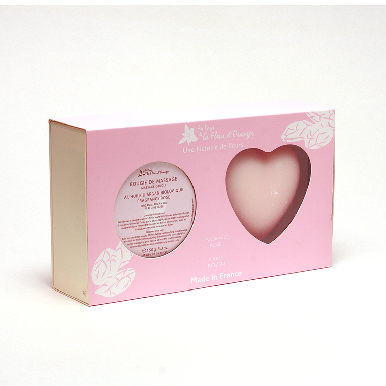 Dans un coffret cadeau : 1 bougie de massage à l’huile d’argan biologique parfumée à la rose 150 g et 1 savon en forme de coeur à l’huile d’argan biologique parfumé à la rose 200 g. Prix : 41,50 €.