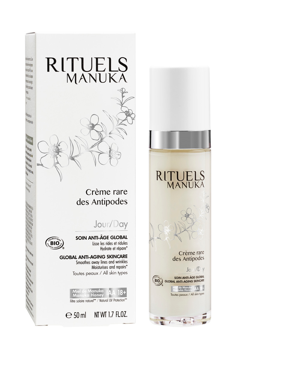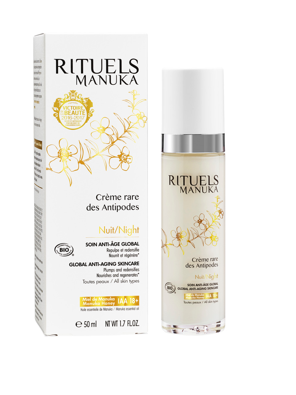 Formulée à partir de miel de manuka IAA®18+ aux propriétés réparatrices et antioxydantes reconnues, la gamme de soins anti-âge Rituels de Manuka est certifiée biologique (COSMEBIO) et exclusivement composée d’ingrédients naturels remarquables. Légère et fondante, la « Crème rare des Antipodes Jour » contient par exemple de l’huile de karanja bio agissant comme un filtre solaire naturel. Primée aux Victoires de la Beauté 2016-2017, la « Crème rare des Antipodes Nuit » est quant à elle composée d’huile essentielle de manuka, un actif puissant, réparateur et assainissant. Onctueuse et veloutée, elle bénéficie comme le soin de jour d’un parfum délicat de lotus blanc. Avec cette nouvelle gamme de soins anti-âge, Rituels Manuka invente la Manukathérapie® pour renouer avec la nature, avec sa nature.