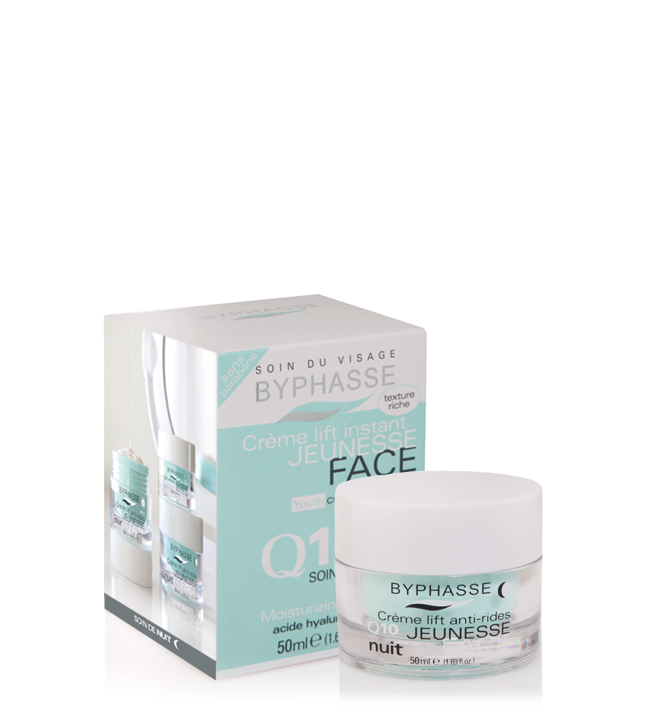 La crème de nuit BYPHASSE lift instant associe la coenzyme Q10, un actif raffermissant efficace avec l’acide hyaluronique qui améliore l’élasticité de la peau.