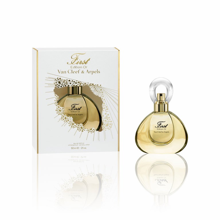 D’un blanc nacré, l’étui laisse découvrir le flacon à travers la découpe d’un éventail. En ultime hommage, il se pare de lettres d’or : First, Edition Or, Van Cleef&Arpels.
