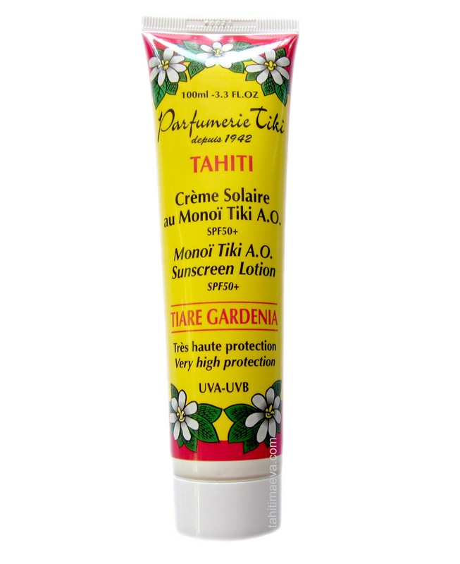 La crème solaire au Monoi indice 50 crée par la Parfumerie TIKI protège efficacement votre peau des UVA et UVB.