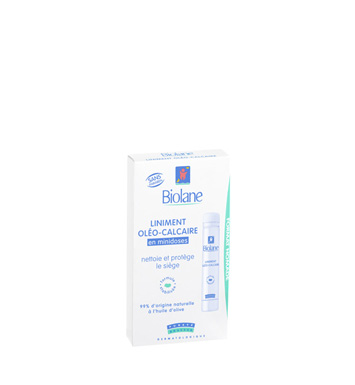 Le Liniment Oléo-calcaire Biolane nettoie et protègeen un seul geste les fesses de bébé en laissant un film protecteur sur la peau ! Une formulation à 99%d’origine naturelle, à based’huile d’olive qui nourrit ethydrate* l’épiderme.