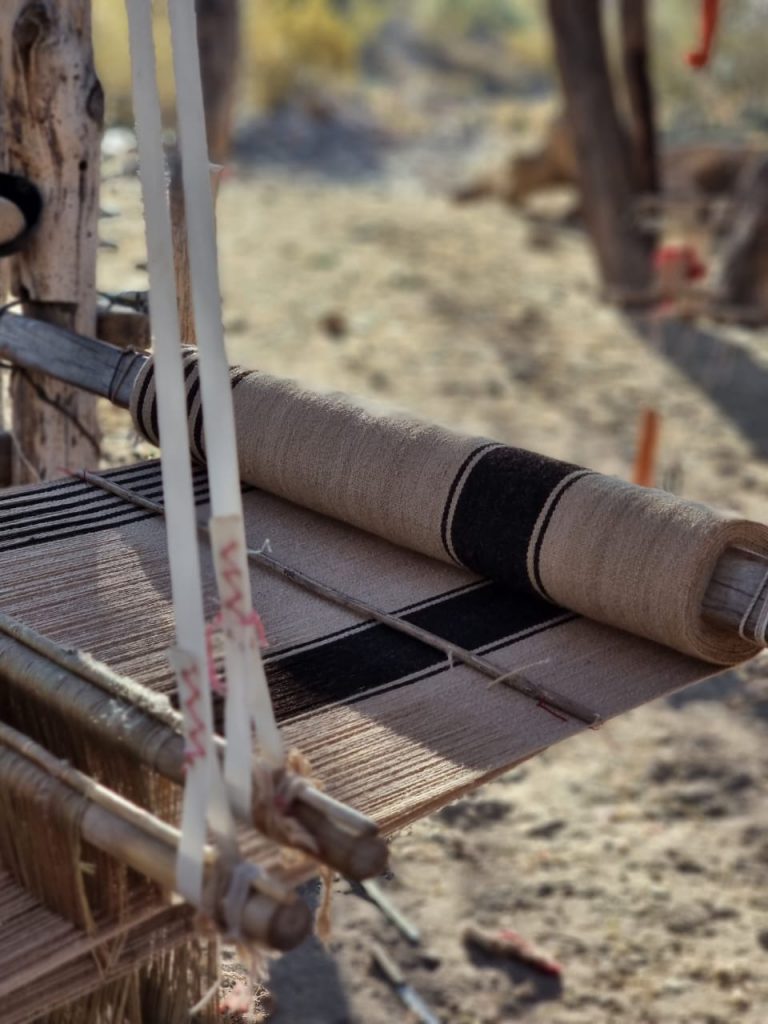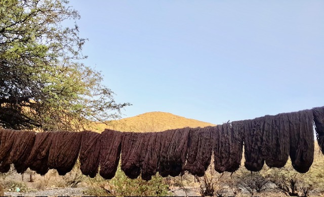 Nous utilisons des laines naturelles de très haute qualité, toujours filées à la main et teintes artisanalement. La palette de couleurs s’inspire de la nature argentine : tons terreux, écrus, noirs profonds, verts, bordeaux et nuances minérales.