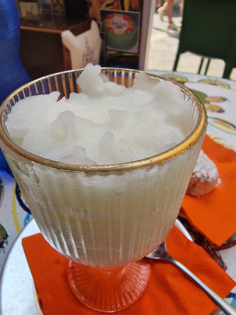 N’oubliez pas de gouter à la limonade sicilienne qui date de 1945 ou à la granite au citron surtout s’il fait très chaud, cela en vaut la peine, c’est un délice. La granita est en général accompagnée d’une brioche, spécialité locale.