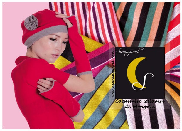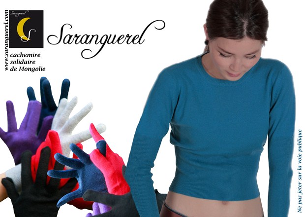 Saranguerel, est importateur et distributeur des produits en cachemire d’exception et raffinée. Elle travaille en étroite collaboration avec des petits ateliers de femmes en Mongolie. La marque française SARANGUEREL, 100% cachemire de Mongolie de qualité exceptionnelle, est issue du commerce solidaire équitable, et éco-responsable. Elle propose un large choix d’articles de prêt à porter homme, femme, enfant ,accessoires assortis : écharpes, bonnets, gants, châles dans des couleurs classiques ou lumineuses d’Asie. Tout les produits, sont, édités en quantités limités, tissés de façon artisanale de qualité exceptionnelles et certifiés. Le but  de la marque est de venir en aide, durablement, aux femmes tisseuses mongoles et aux nomades récoltant du cachemire, en les rémunérant équitablement.