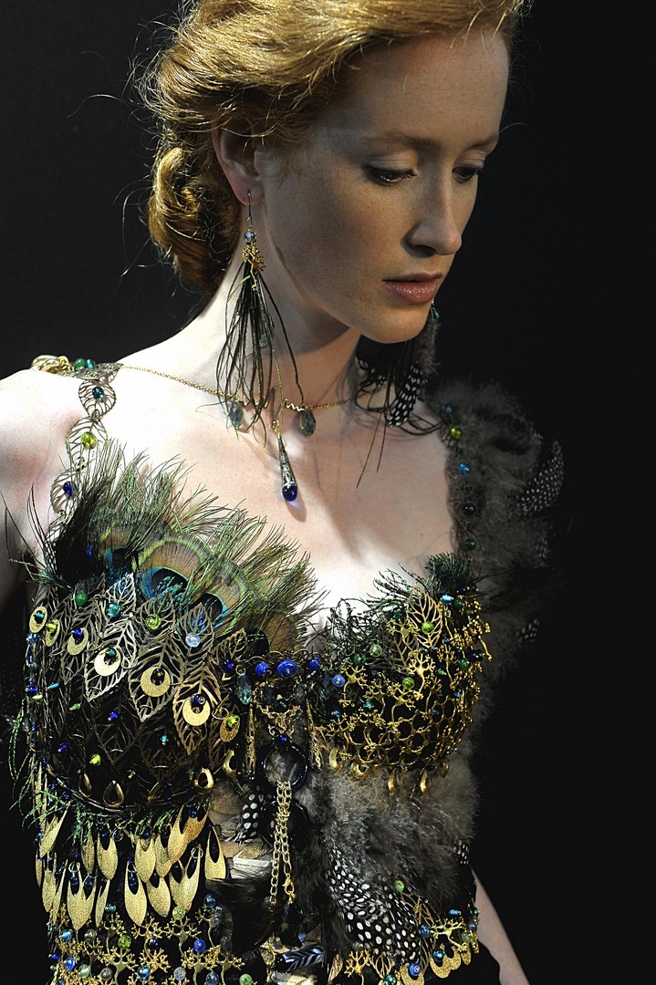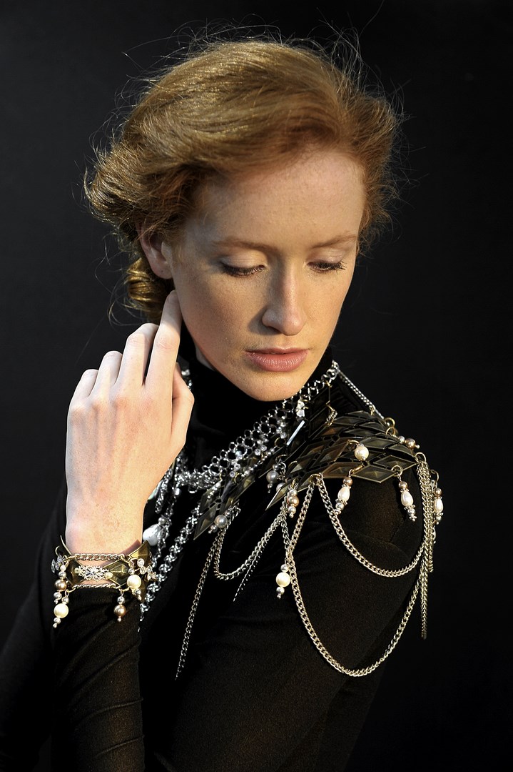 Chacun doit s’approprier la place qui est sienne. Dans une quête vitale de création, j’en suis arrivée à me former au travail du verre au chalumeau, obtenant ainsi le label des Ateliers d’Arts de France en 2014. Ce travail consiste à travailler le verre en fusion, lui donnant des formes, des couleurs et des effets grâce à un mouvement perpétuel, visant à en maîtriser à la fois l’état visqueux et solide. J’associe la sensibilité de ce travail à celui du violon qui ne possède aucun repère et qui permet une très grande interprétation et liberté d’expression. Dans le but de donner sa pleine dimension à mon art, j’ai décidé d’accompagner mes pièces de verre d’un écrin respectant mon univers personnel et intime. J’ai donc intégré le travail du métal et du laiton en particulier, afin de créer des pièces plus exigeantes et abouties telles que je les conceptualise. Ainsi en sciant, tordant, soudant, le métal j’offre à mes pièces de verre une nouvelle dimension. Les mailles de laiton sont fixées une à une, permettant de travailler les parures telles des pièces textiles et peuvent ainsi prendre toute forme, et toute dimension. Les estampes de métal donnent une structure et un aspect antique qui me tient à cœur. Je ne me fixe aucune limite et expérimente toute technique et tout métier d’art, qui pourraient servir et mettre en valeur mon travail de verrier d’art, comme la plumasserie très présente dans mon travail.