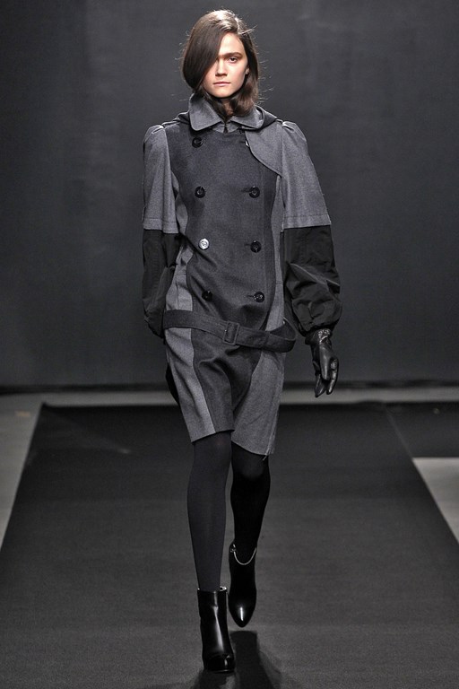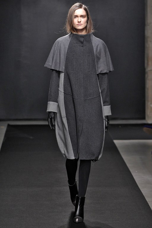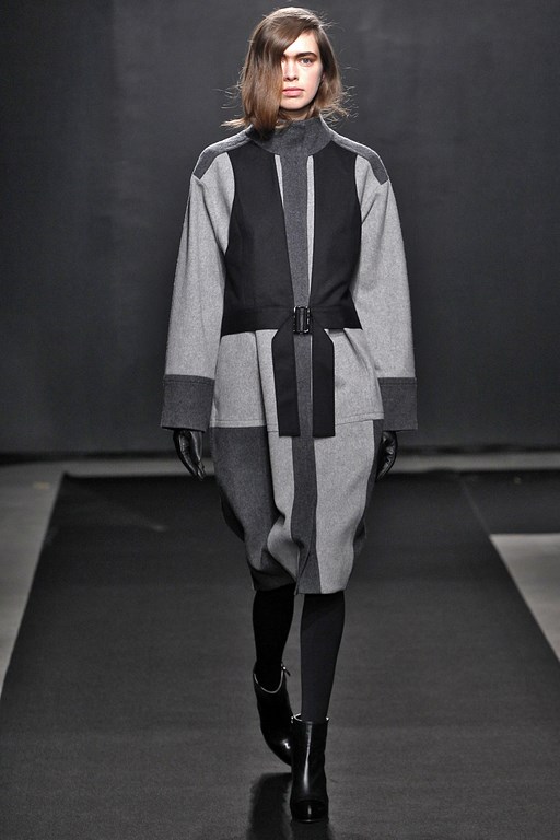 Les premiers passages font la part belle au noir et blanc façon géométrie avec des jeux de matières où l’angora côtoie drap de laine et néoprène.