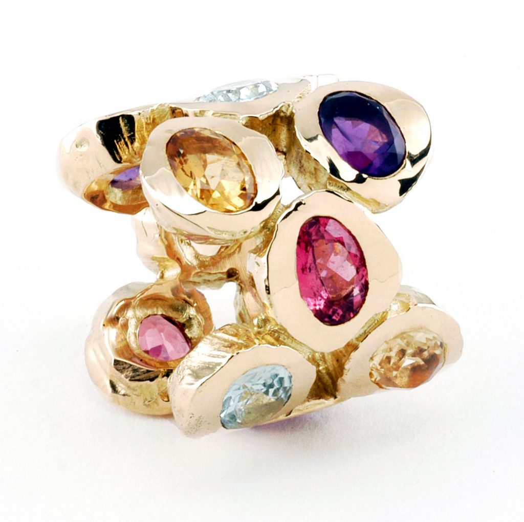 Elle aime l’or doré qu’elle travaille avec merveille, les grosses pierres précieuses et fragiles à la fois, chaque pièce est une histoire qu’elle découvre au fil de la création. Elle se laisse guider par la promesse d’une pierre et là l’inspiration se dévoile. Elle magnifie le précieux métal doré sous toutes ses formes : martelé, roulé ou aplati. Et l’or le lui rend bien.