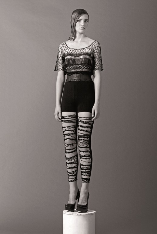 L’Univers créatif d’Augustin Teboul est très sombre et particulier, il est inquiétant et en même temps hypnotisant. Il mêle le noir avec le mat brillant, le cuir et le travail de crochet.