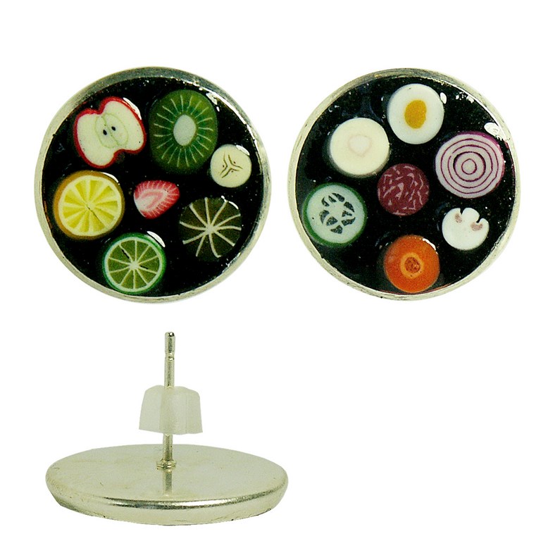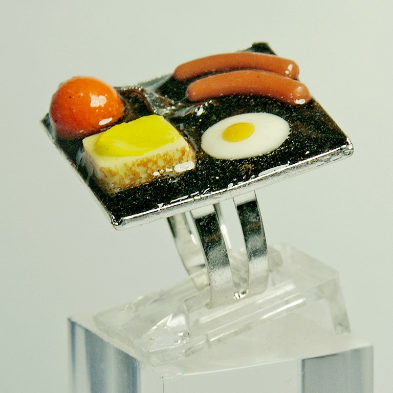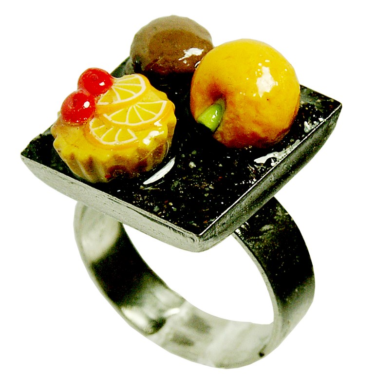 La base des bagues et des boucles d’oreilles est en métal argenté, patiné ou doré. Les petites scénettes sont faites avec des figurines en plastique moulé et peint à la main.