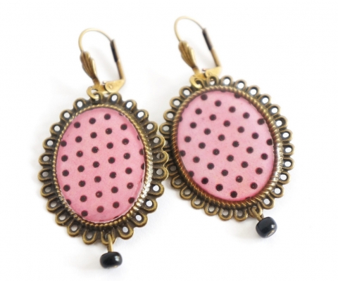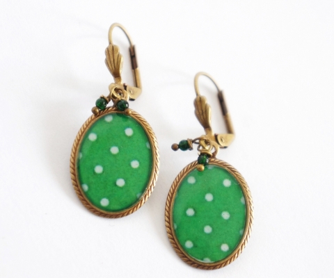 Boucles d\’oreilles en laiton, motif pois blancs sur fond vert recouvert de résine, petite perle verte. The sisters, www.thesisters-lesite.com . 22.00 22.00€THE SISTERS est une marque de bijoux faits main et réalisés en petites séries.