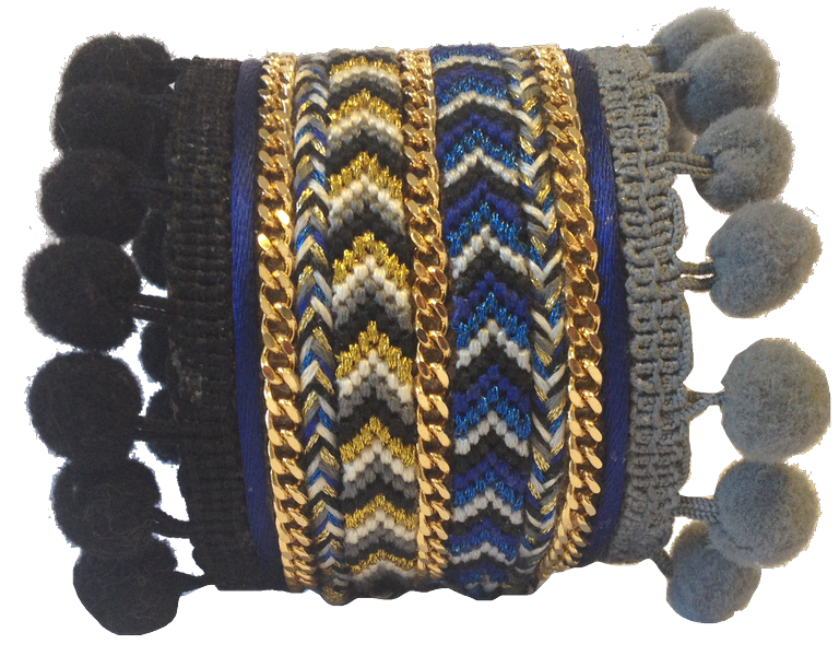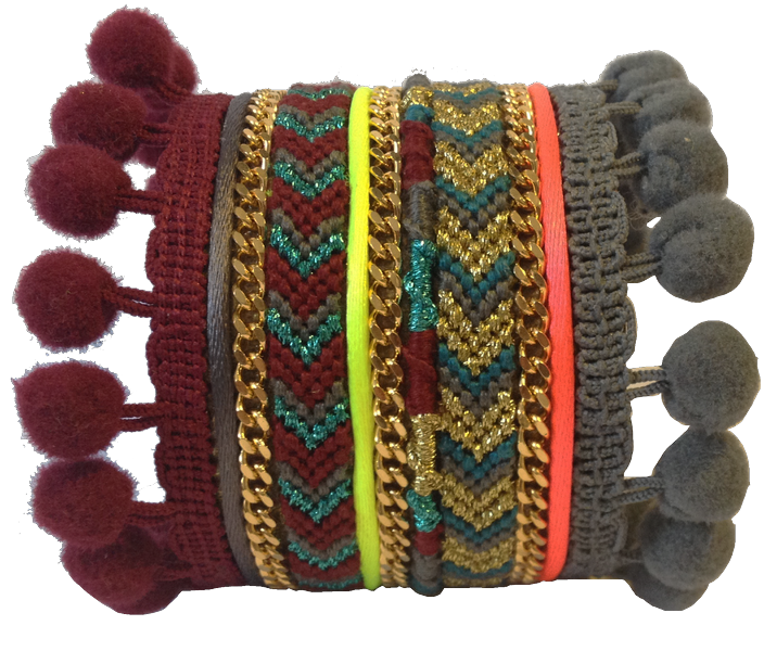 Manchette en métal ornée de bracelets brésiliens en coton et lurex, chaînes en métal doré, pompons et fils colorés.