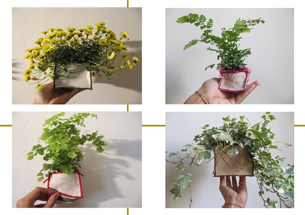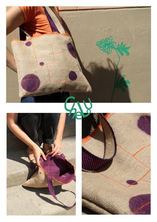 De la création d’objets de décoration pour la maison ( cache-pots, casiers de rangement, sachets, guirlandes…) à l’accessoire de mode (sacs) en passant par des installations in situ elle utilise ce matériau comme signature. La marque s’appelle CheLoU, les produits sont fabriqués avec instinct et spontanéité. Ils sont bruts, naturels et solides , les formes sont simples et pratiques.
