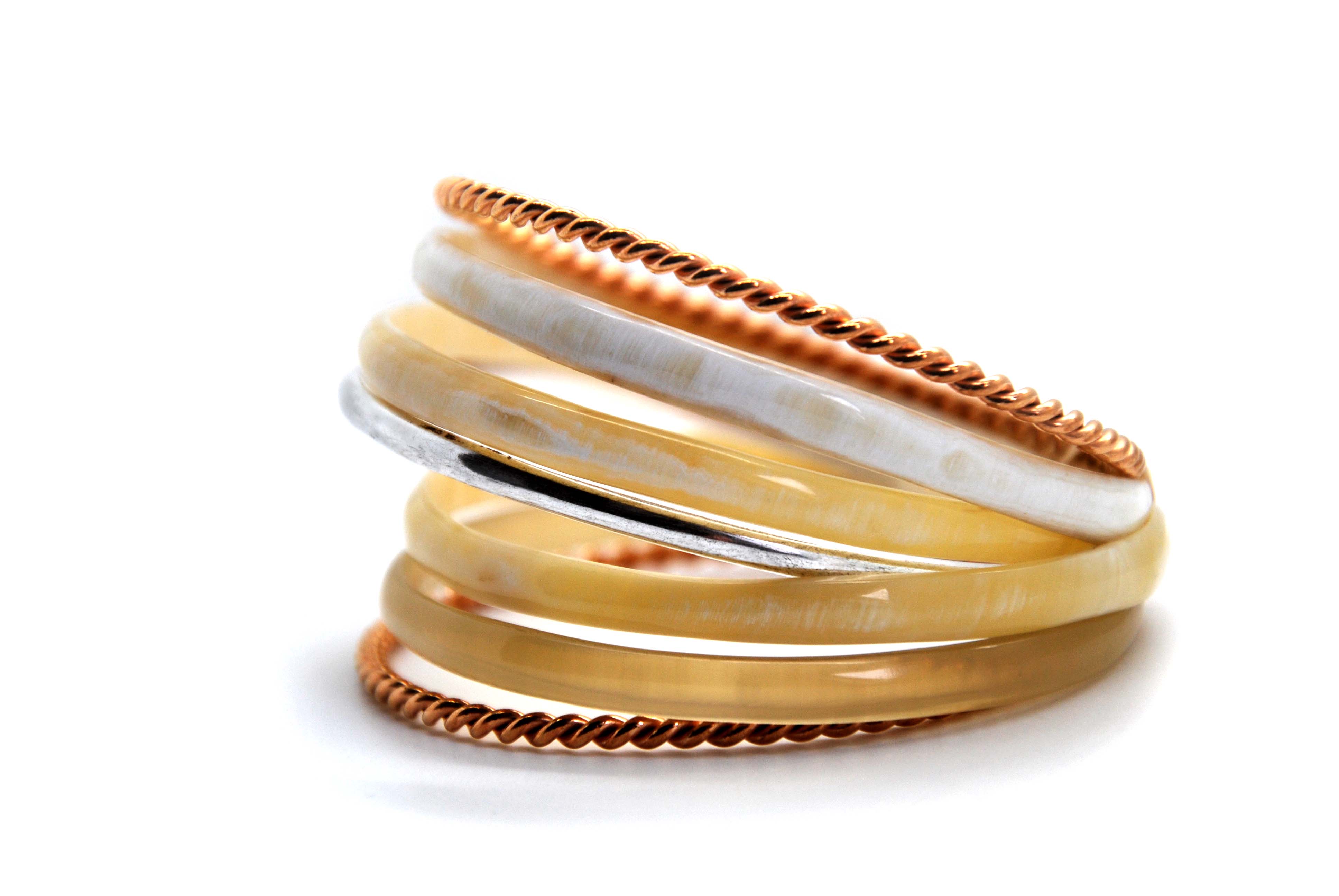 Les bijoux de la collection sont inspirés des formes ancestrales et des lignes géométriques industriels autour d’un mélange inattendu des matières comme la corne et le métal en contraste avec l’argent ou le métal doré à l’or rose.