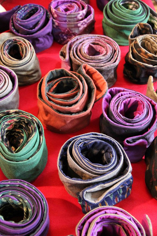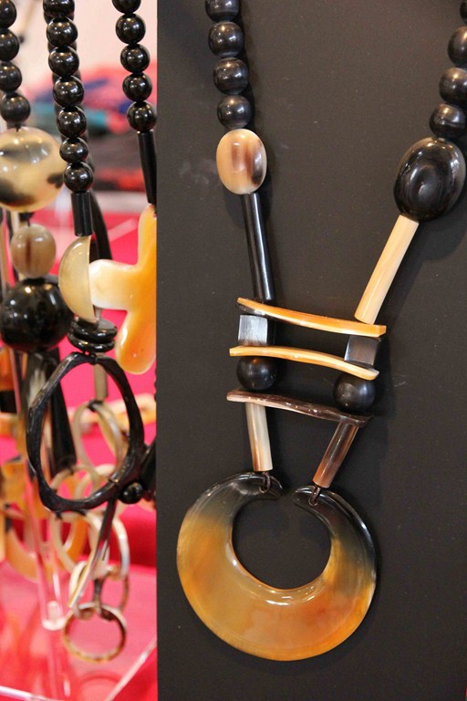 qui dessine et fait fabriquer nombreux accessoires dont des ceintures ou bandeaux de soie et d’ikat, et d’incroyables bijoux en corne.