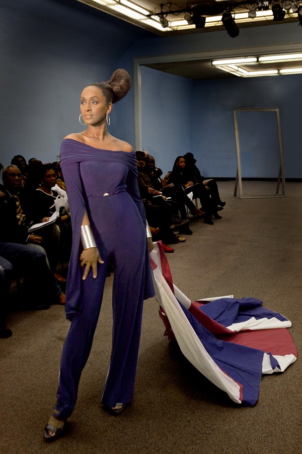 Mr. Says literally has a patriotic frame of mind, as displayed by the leggy models that cascade onto the runway. Each model steps through a ten foot silver frame before presenting garments that reflect old glory. A small collection of red, white and blue dresses complete with stars and strips open the Douglas Says presentation. “I’m patriotic about my country and I was inspired by President Barack Obama’s comments during his State of the Union Address. Obama said, “We need to out innovate, out educate and out build the rest of the world”. Our President is demanding a tall order from us all. So I’ve adopted the “Made In America” mission as my mission. My humble beginnings started in the African-American community where fashion and accessories have always been iconic products. So, what is a better opportunity for fashion enthusiast to express American patriotism than to wear our colors with fashions made in America?