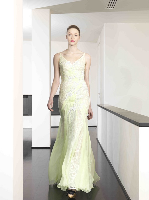 Cette femme idyllique joue avec les transparences et pour le toucher, use et s’amuse avec la dentelle, la guipure et la mousseline de soie drapée.