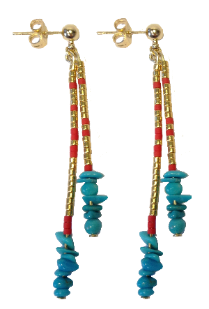 Boucles d’oreilles Marrakech, en perles de verre dorées à l’or fin 24 carats, perles de verre rouge et véritables turquoises, 49 €