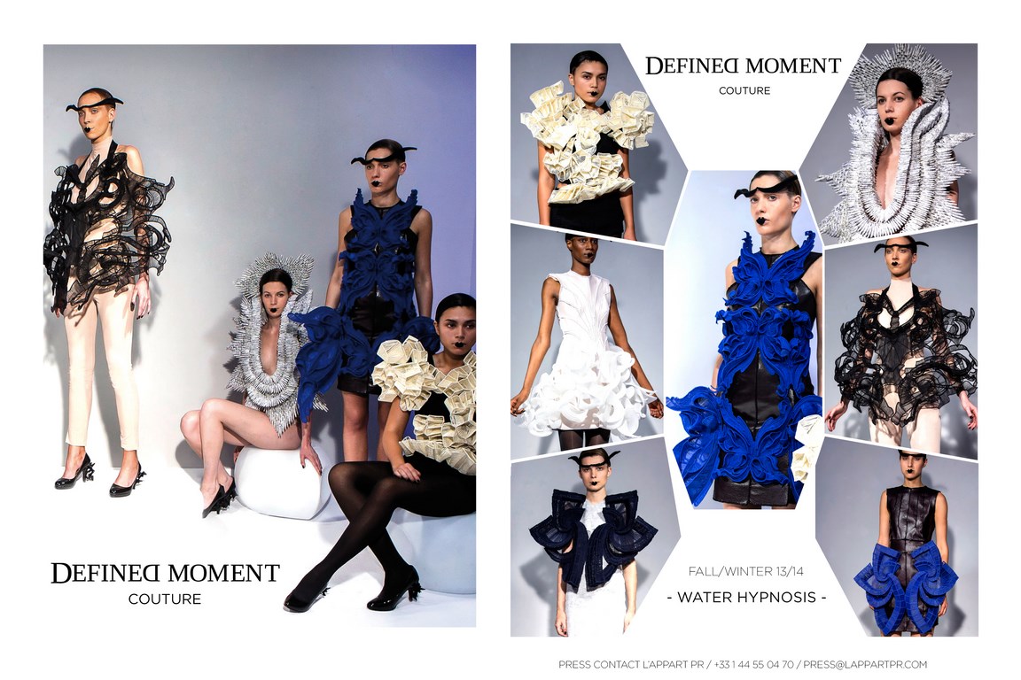 Née en 2011, la maison Defined Moment offre des collections couture qui mêle architecture des formes et délicatesse des matières. La créatrice, Tran Thi Thanh Nga diplômée d’Esmod Paris, propose des pièces féminines, élégantes et résolument modernes qui rendent les silhouettes ajustées, avant-gardistes et hors du temps. Pour la collection hivernale, la griffe n’a pas dérogé  à la réglé, beaucoup de construction couture et superpositions géographiques pour une approche totalement magistrale et futuriste de la femme.