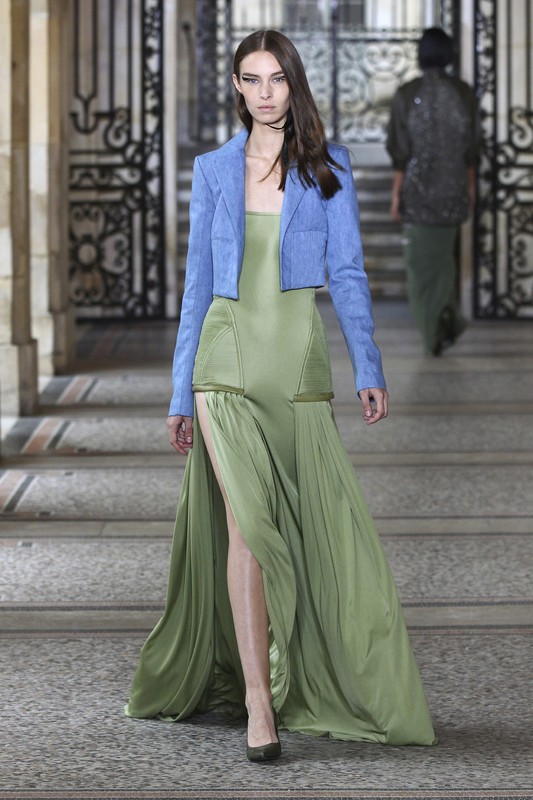 “Jolie madame” denim dresses have strapless tops placed directly on tulle. Leather braiding gives a muscular, radical touch to the look. Herringbone in songket, that traditional Indonesian brocade, gives rhythm to the volume of a jacket with a fox fur collar.