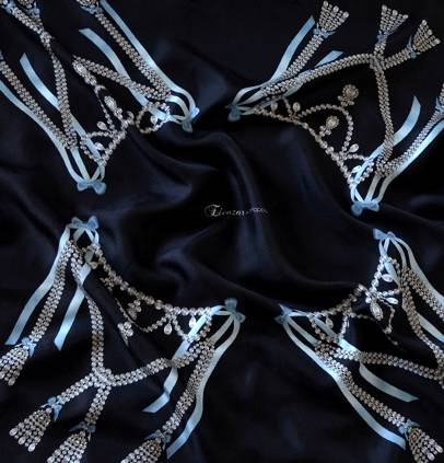 Comme matière, elle a choisi le twill de soie, tissu de soie souple avec ses diagonales caractéristiques créées par le jeu des fils de chaîne qui se décalent d’un fil de trame à chaque rang et surtout ses propriétés de mise en valeur des couleurs d’impression.
