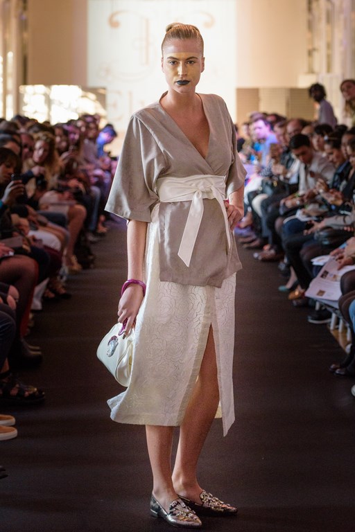 Jouant beaucoup avec les volumes propres aux tenues du Japon, ELVANA fait défiler des silhouettes portant des manches ¾ larges et cubiques. Revisités, les classiques du Japon se portent courts, colorés, transparents et vaporeux, décontractés et libres…
