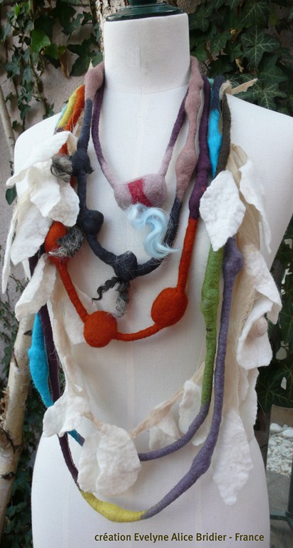 « Pétrir la laine, la frotter à l’eau savonneuse et faire naître, du bout des doigts, une nouvelle matière, flexible et malléable, c’est faire vivre un magnifique moyen de création qui incarne puissamment la chaleur, la protection… J’obtiens de sublimes textures offrant tout à la fois épaisseur et transparence ».