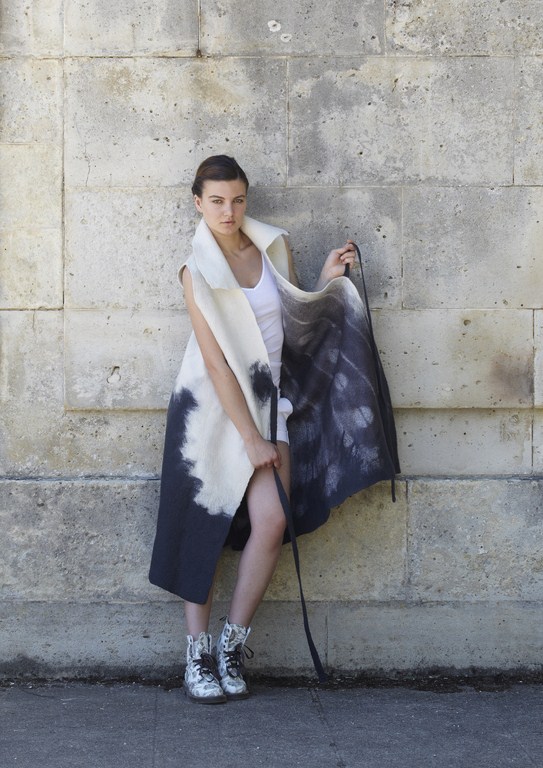 C’est cette double inspiration qu’on retrouve dans les créations d’Evelyne Alice Bridier : parfois elle dessine ou sculpte la matière, poussée par l’envie de traduire en textile des feuilles, des fleurs, des motifs, à la façon des jardins japonais ; parfois ce sont les vêtements traditionnels d’Asie qu’elle réinterprète, laissant aussi parler l’expérimentation d’une belle matière et de nouvelles couleurs. Son langage minimaliste donne à son travail un design épuré. Sa pratique de la technique de teinture japonaise «shibori» et du feutre est l’occasion de faire naître des textiles surprenants.