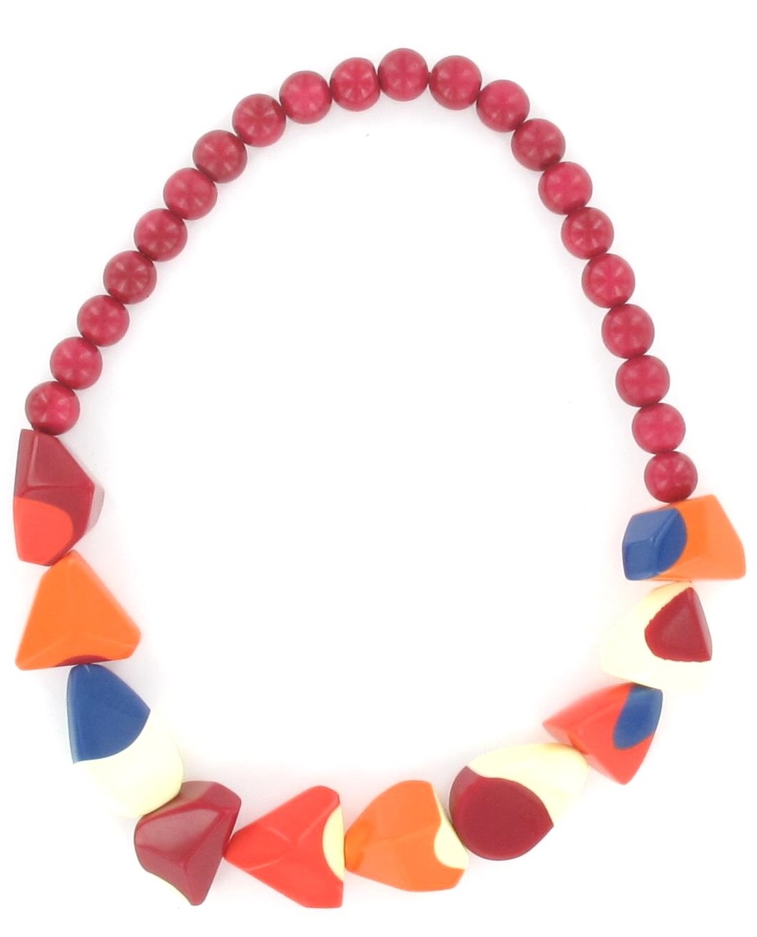 C – Collier court sur fil élastique, boules en bois et formes asymétriques en résine.