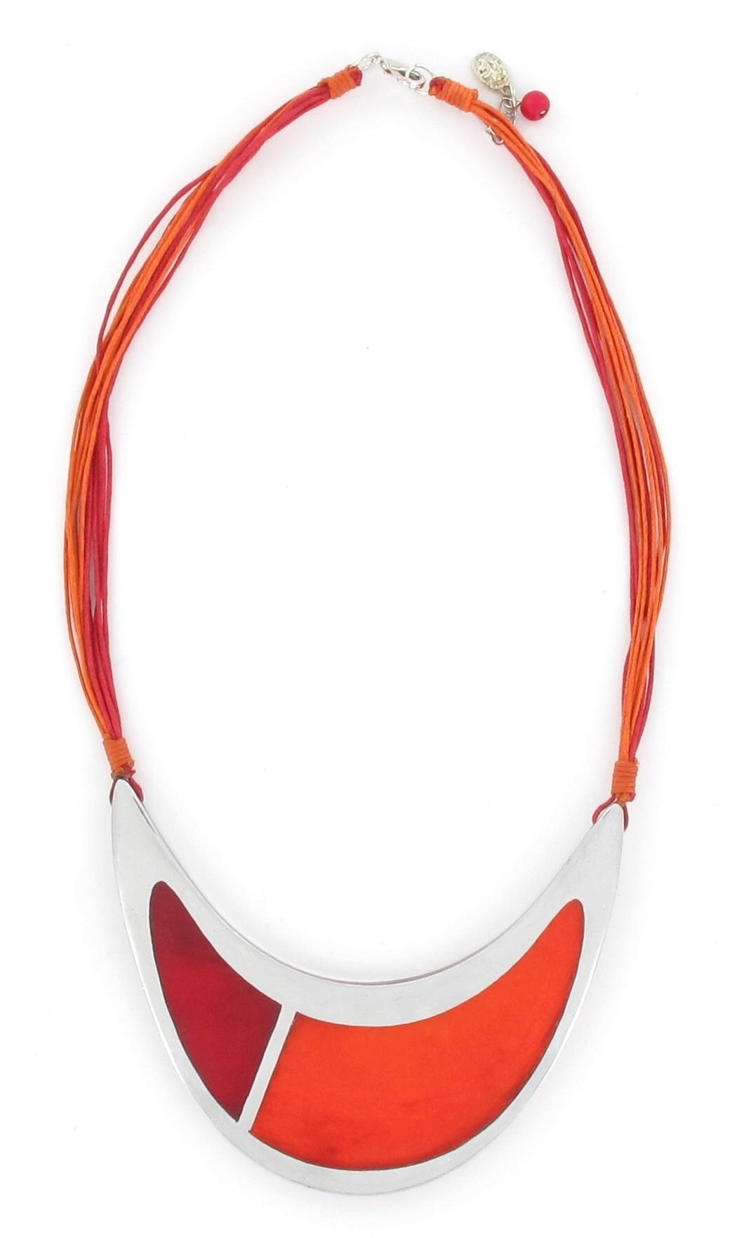 B – Collier plastron en nacre recouvert de résine et d’aluminium. Cordon multi fils de coton.