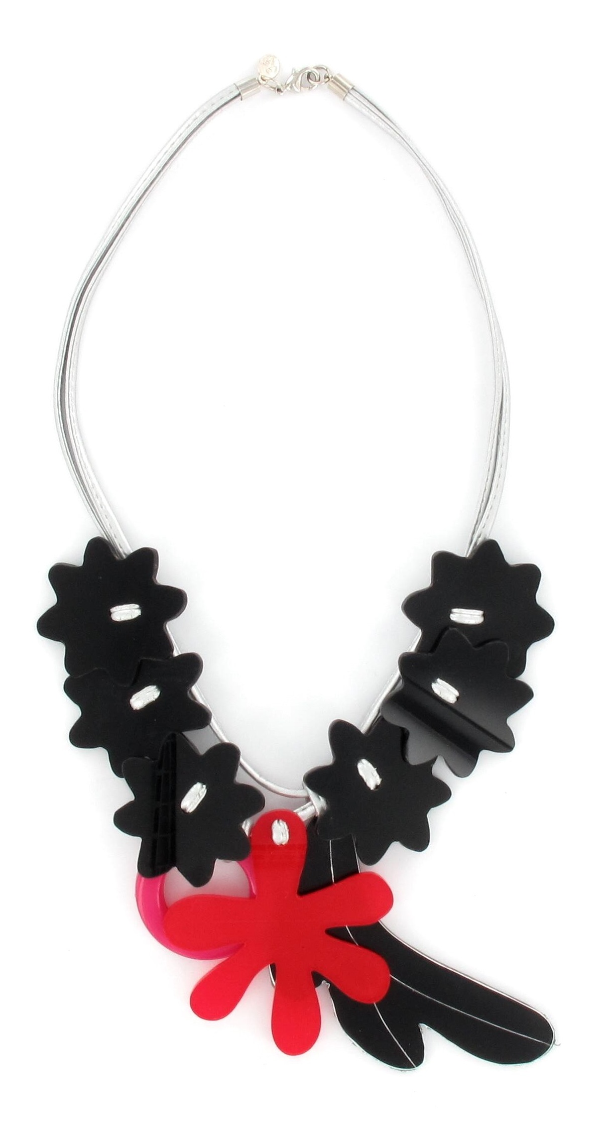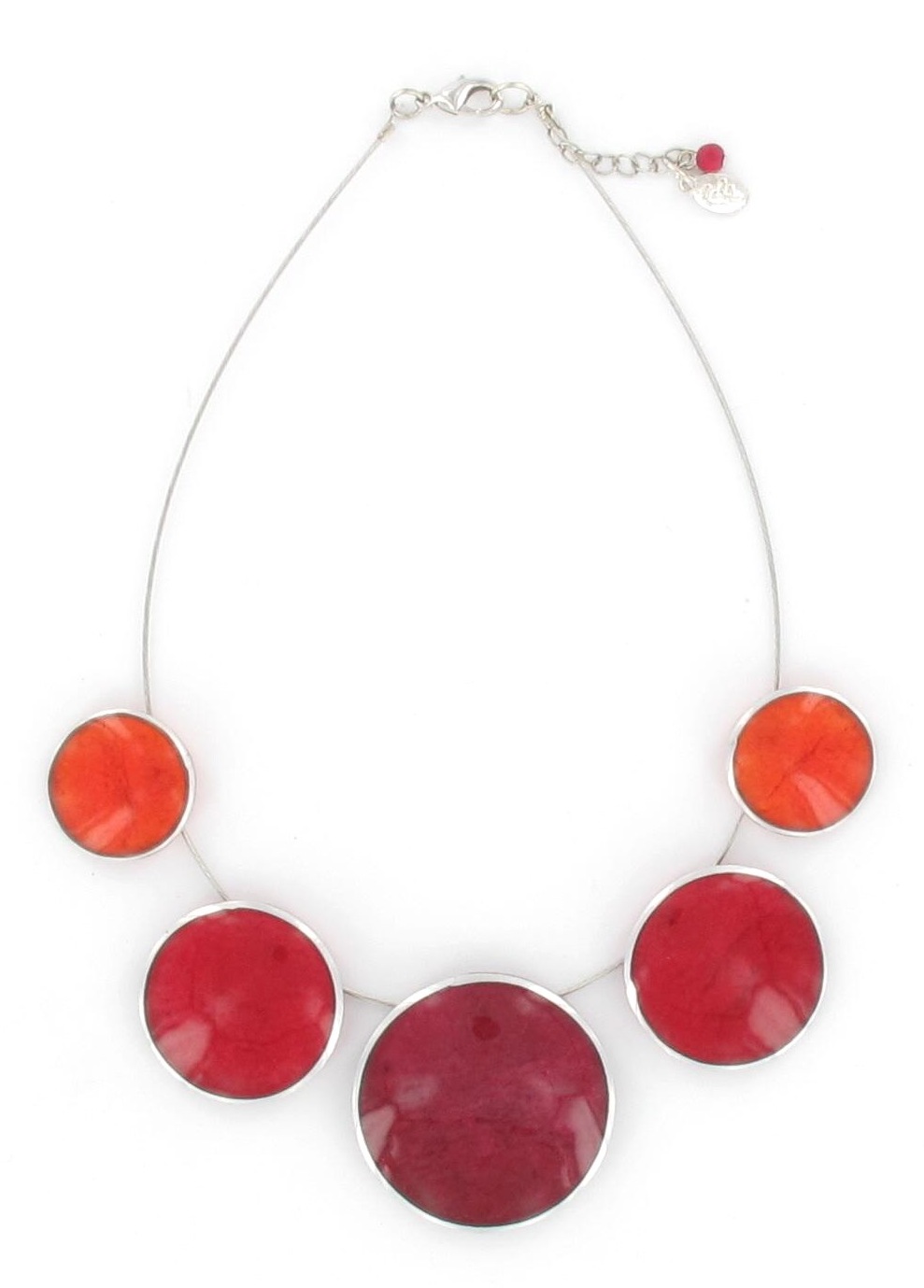 A –  Collier câble et pièces en résine de couleurs cerclées d’aluminium.