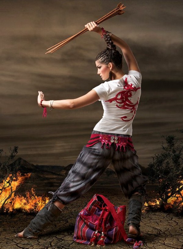 Grâce à ses voyages, elle a recueilli l’esprit du costume tribal et s’en est emparée, gardant ainsi, l’écho des tambours des Nations laissées derrière elle, dans les murs de son âme implacable. Son corps a été retrouvé, une flèche plantée entre les cotes, ce qui indique qu’elle est peut-être morte au combat. Il est également dit que, sept jours plus tard, à l’endroit ou son sang s’est répandu, un arbre a germé, aux fleurs magnifiques de toutes les couleurs. Et sur la plus haute branche de l’arbre Fugoura, au milieu d’un enlacement complexe de fleurs mystiques, se trouvait le cœur de la femme, posé là, chaud, palpitant et provocant.