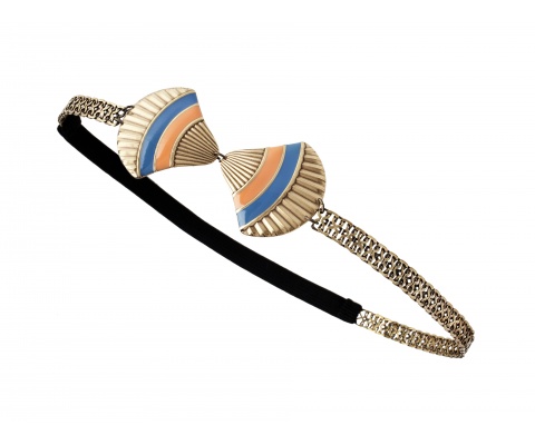 Headband Coquillage Abricot et Bleu. Estampes en laiton en forme de coquillage et émaillées. Le headband s’adapte à toutes les têtes grâce à un élastique. Dimensions : longueur : 4 cm – largeur : 4 cm. VIRGINIE MAHE, sur www.virginiemahe.com. 48.00€