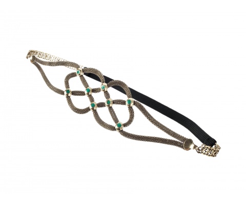Headband Croisement Vert. Estampe entrelacée en laiton émaillée. Le headband s’adapte à toutes les têtes grâce à un élastique. Dimensions de l’estampe : longueur : 18 cm – largeur : 4 cm. VIRGINIE MAHE, sur www.virginiemahe.com. 48.00€
