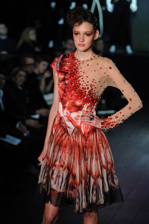 5. Robe imprimée en satin et chiffon, rebrodée de cristal émaillé
