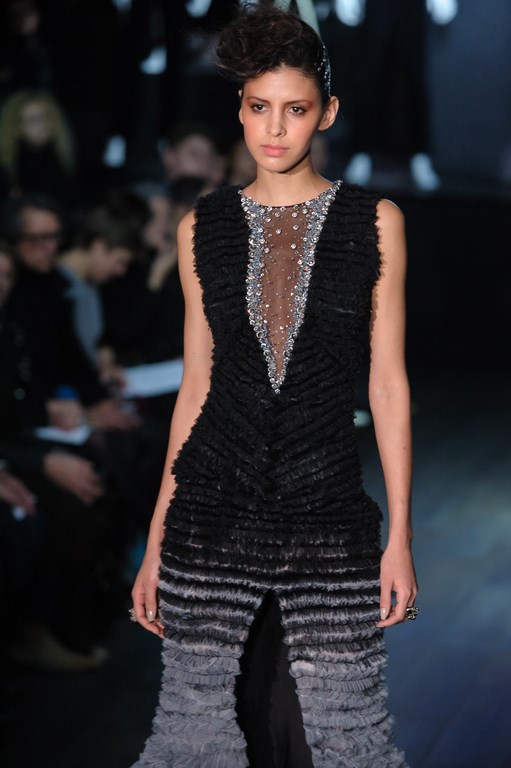 2. Queue de pie en astrakan et vison, gilet en satin, tulle et cristal, pantalon en dentelle