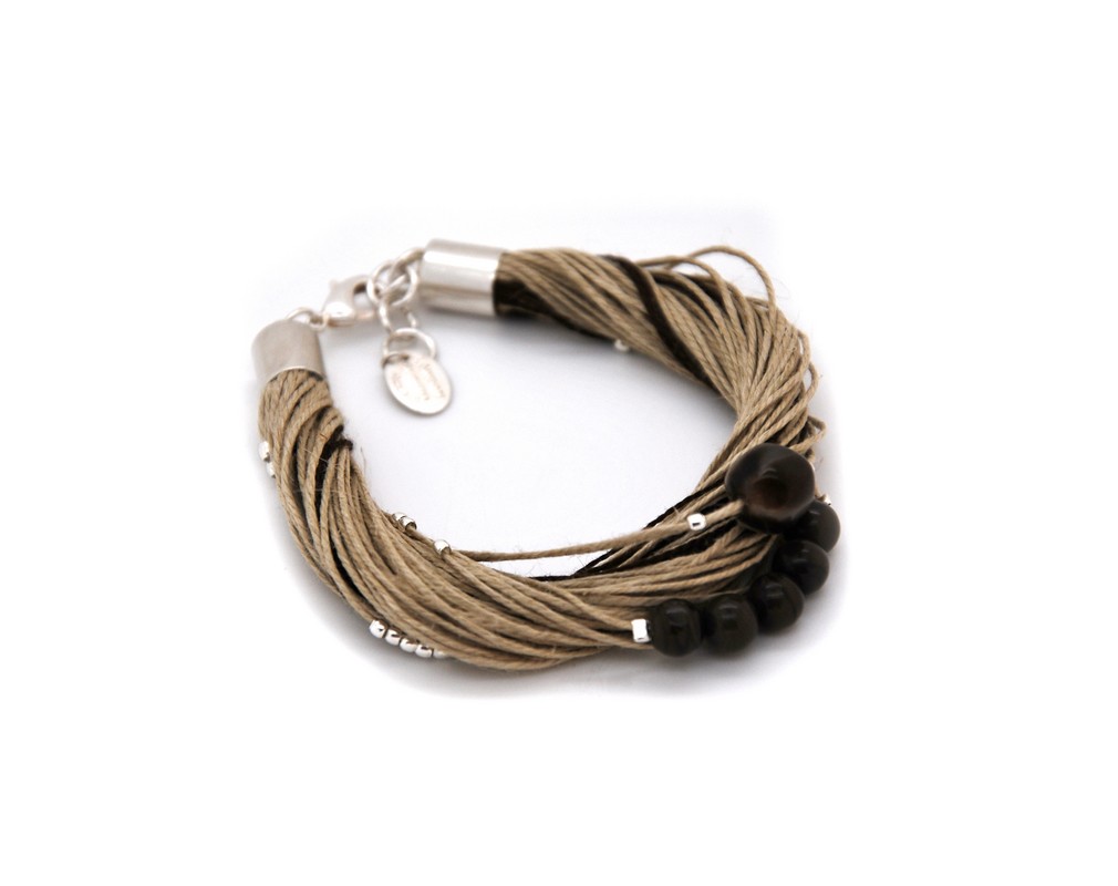 Bracelet en lin tissé et coton de couleur comportant une perle en corne, d’une multitude de petites perles sur monture en plaqué argent et de pierres fines, que du bonheur et du beau durable made in WORLD !