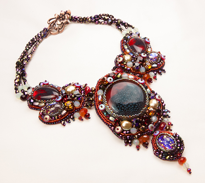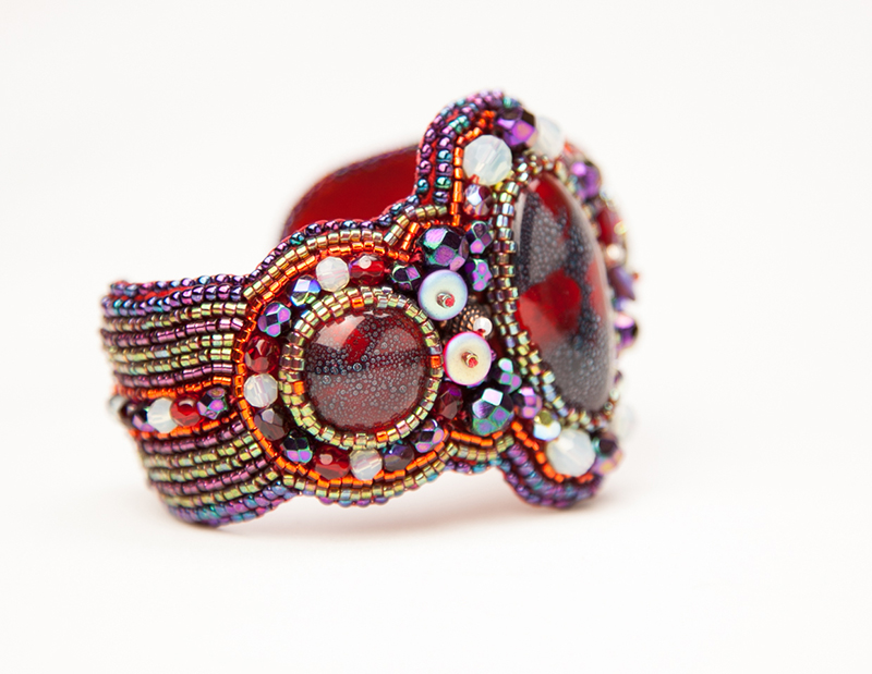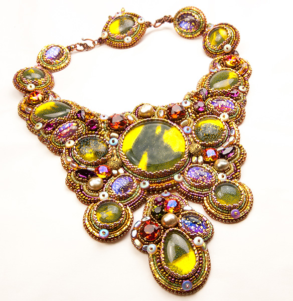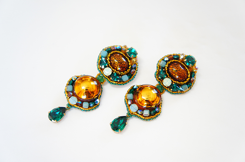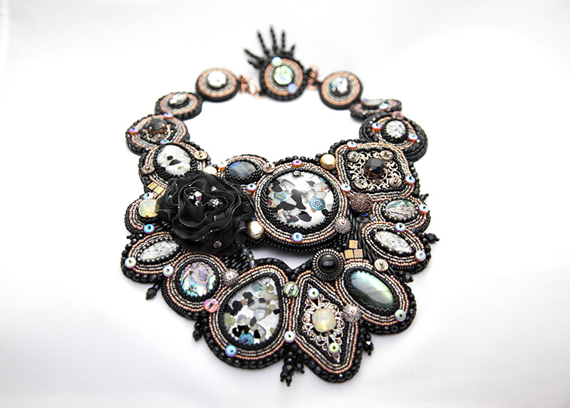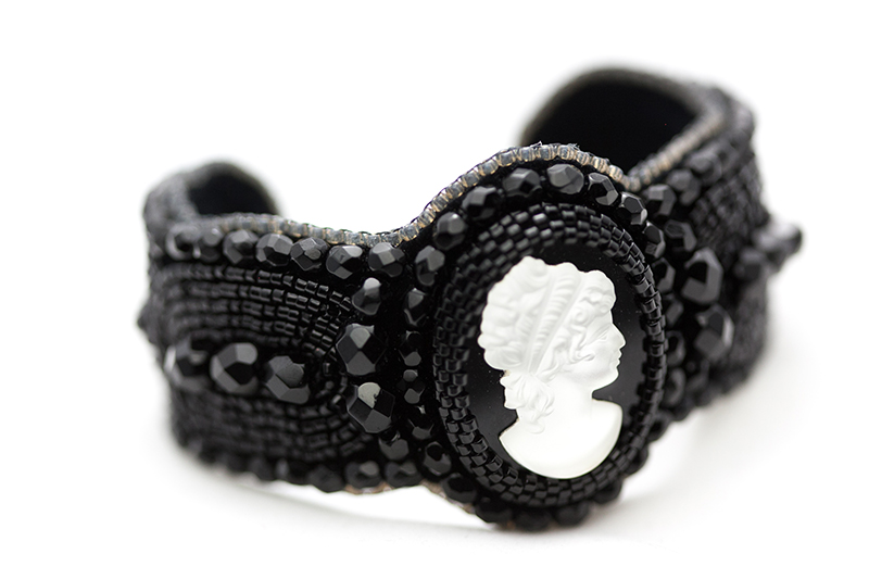 Ce sont des bijoux créés et réalisés entièrement à la main tout en broderie de perles. Chaque perle est posée à l’aiguille. Cette technique de broderie permet de sertir des cabochons, des pierres et de réaliser de multiples motifs. Chaque création mixte différentes techniques : broderie de rubans, de perles, tissage. Le mélange de matières s’harmonise avec les couleurs. Galon, soie, velours, organza, satin, passementerie ancienne sont ornées de broderies de perles, de reflets de pierres semi-précieuses, de cristaux Swarovski, ou de cabochons artisanaux.Au fur et à mesure de sa réalisation le bijou évolue et se transforme pour arriver à son équilibre. Le tissage de perles se fait à partir de 4 fils qui sont tissés entre eux tout en insérant les perles une à une durant le travail. Ce type de tissage permet de réaliser des motifs avec les perles et donne au final un bijou très souple, agréable à porter et très solide.
