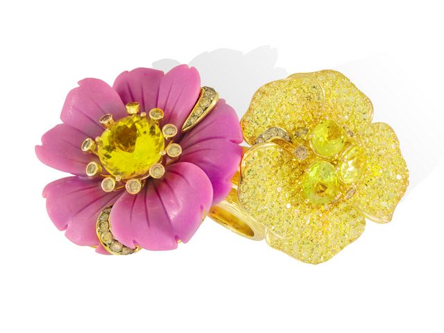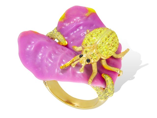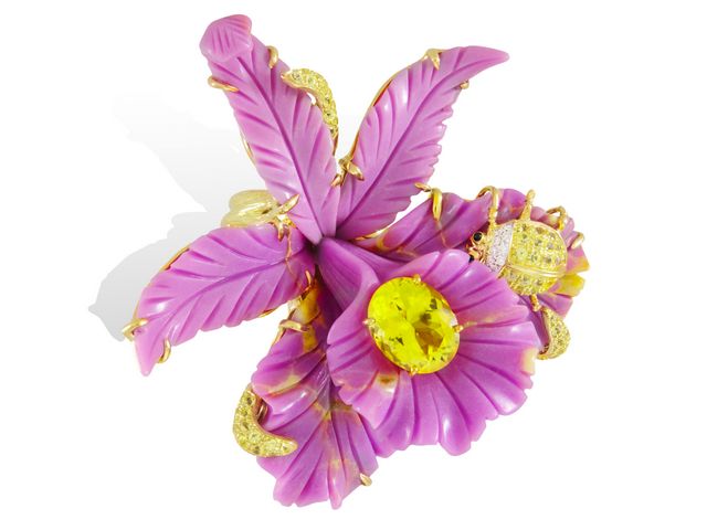 Proche de la texture de la turquoise, la douceur de sa couleur mauve à veinules jaunes est magnifiée par l’acidité de la tourmaline jaune.