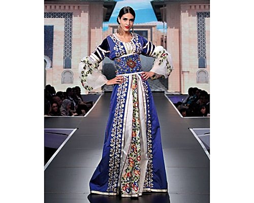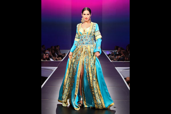Toutes les techniques sont bonnes, le Caftan n’a de cesse d’être revisité au niveau de la coupe, du choix des tissus, des accessoires et des broderies. Il y a aujourd’hui, beaucoup d’innovations ” on fait même de l’insertion dans les ceintures avec de la dentelle métallisée, c’est une première au Maroc et c’est moi qui l’ai introduite” ajoute la designer. C’est une technique qui vient de France, découverte par un physicien qui utilise toutes les matières, même des insectes et on peut en faire des bijoux. Meriem Boussikouk a choisi de faire des ceintures par cette technique, avec de la dentelle pour parvenir à ces formes que l’on ne peut pas obtenir avec les bijoutiers de son pays. Le rendu est magnifique car le Caftan finit par absorber toutes les nouveautés au niveau des matières et des accessoires.