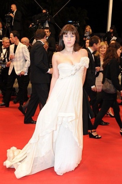 Il s’agit de l’actrice française MYLENE JAMPANOI qui a choisi une longue robe bustier en tulle de Calais beige de la collection GEMY COUTURE de Gemy MAALOUF pour monter les marches du film Reality, le vendredi 18 Mai 2012. Une robe de princesse à couper le souffle !