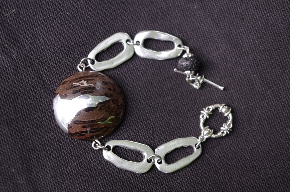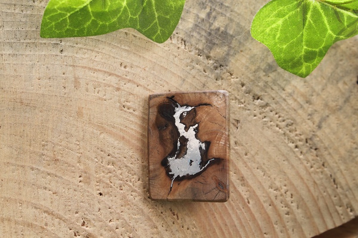 L’utilisation d’étain coulé dans les interstices du bois, permet d’obtenir un bijou unique.
